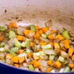 - Add the chopped onions, carrots, and celery to the pan. Cook for a few minutes until the onions become transparent.